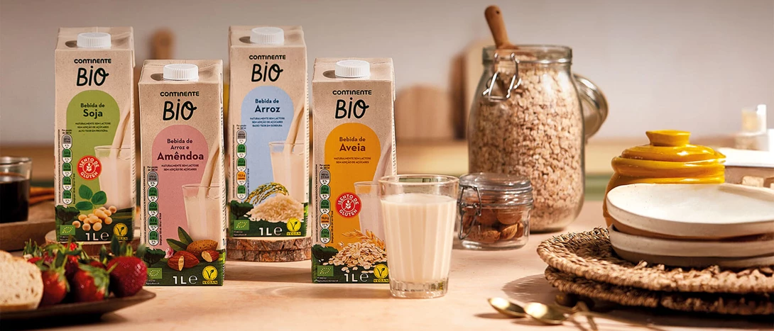 No Continente encontra uma vasta gama de bebidas de origem vegetal das marcas Continente Bio e Continente Equilíbrio, nomeadamente: