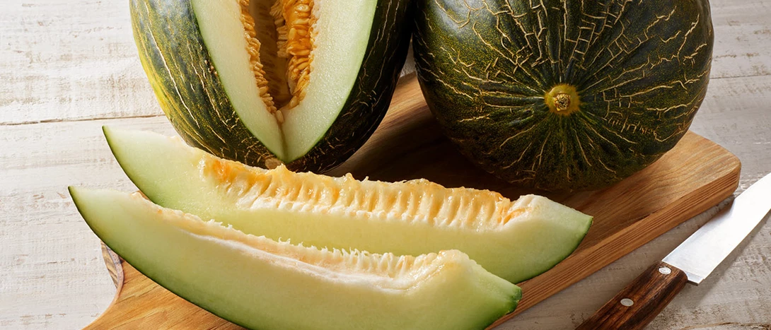 Uma escolha rigorosa dos nossos produtores do Alentejo e do Ribatejo de melões no ponto ótimo de maturação. Colhido por mãos experientes, o melão branco tem uma polpa macia, sumarenta e doce. Fruto fresco e ligeiro, satisfaz os paladares mais exigentes, tanto de crianças como de adultos.