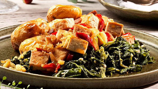 - Tofu com Broa, Batatas a Murro e Grelos Salteados: uma reinterpretação vegetariana do famoso bacalhau com broa, perfeita para quem gosta de sabores tradicionais.