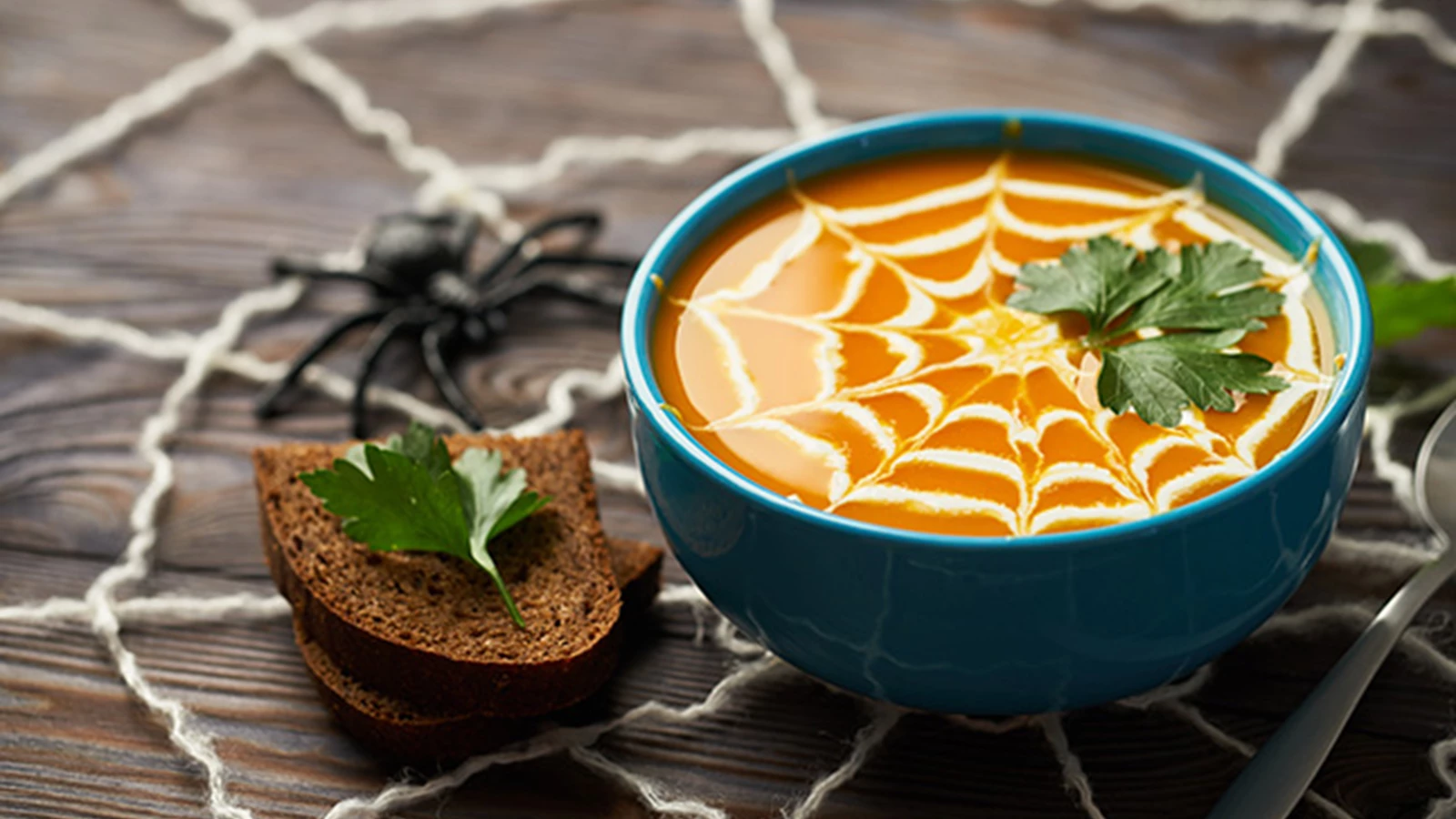 Este creme de abóbora é um prato delicioso e simples de preparar. Nesta receita, a abóbora é assada no forno para um sabor mais intenso e o crumble de bacon dá uma textura crocante. Distribua o bacon no topo para fingir que são minhocas ou larvas a rastejar pela sopa. Em alternativa, use natas ou leite de coco para desenhar uma teia de aranha.