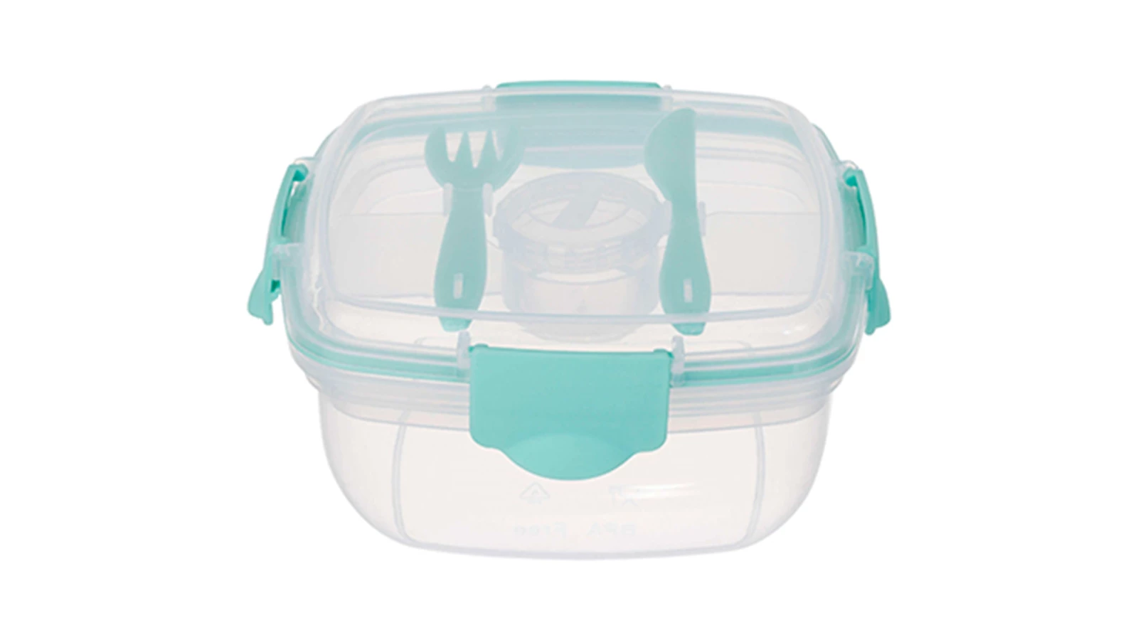 Esta caixa em plástico tem várias divisórias internas que facilitam o armazenamento. É ideal para manter diferentes alimentos frescos e saborosos sem misturar sabores ou texturas indesejadas. É perfeita para quem deseja levar uma refeição completa para qualquer lugar, com a conveniência de ter talheres integrados e até um compartimento para molhos.