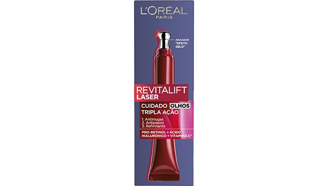 Na zona dos olhos, onde as linhas finas, papos e olheiras se tornam mais visíveis, aposte no Creme de Olhos Revitalift Laser da L’Oréal. Formulado com Pro-Xylane™, pro-retinol, ácido hialurónico e vitamina C, este cuidado tem uma textura leve e um aplicador “efeito gelo”. Hidrata intensamente, reduz rugas, desincha os papos e devolve firmeza e luminosidade a esta área sensível do rosto.