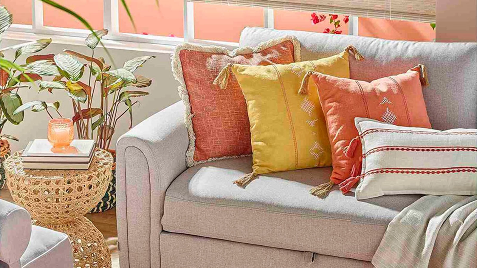 - Comece pelos essenciais, como um sofá confortável e almofadas em diversas cores e texturas.