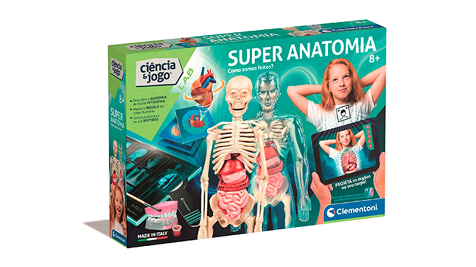 Com a Ciência & Jogo - Super Anatomia da Clementoni, as crianças podem montar um esqueleto, reconstruir órgãos e ainda descobrir os cinco sentidos através de várias atividades. Este jogo inclui ainda uma aplicação interativa que utiliza realidade aumentada para visualizar os principais sistemas do corpo em 3D, além de cartas com jogos interativos.