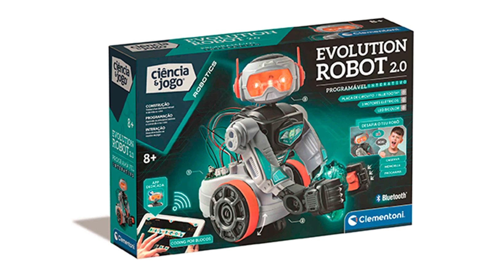 O Evolution Robot 2.0 é um jogo divertido que ensina os princípios da robótica de forma interativa: a criança deve montar e programar o seu próprio robot. Este robot tem braços móveis para levantar e mover objetos, além de motores elétricos, luzes LED integradas, Bluetooth e um altifalante.