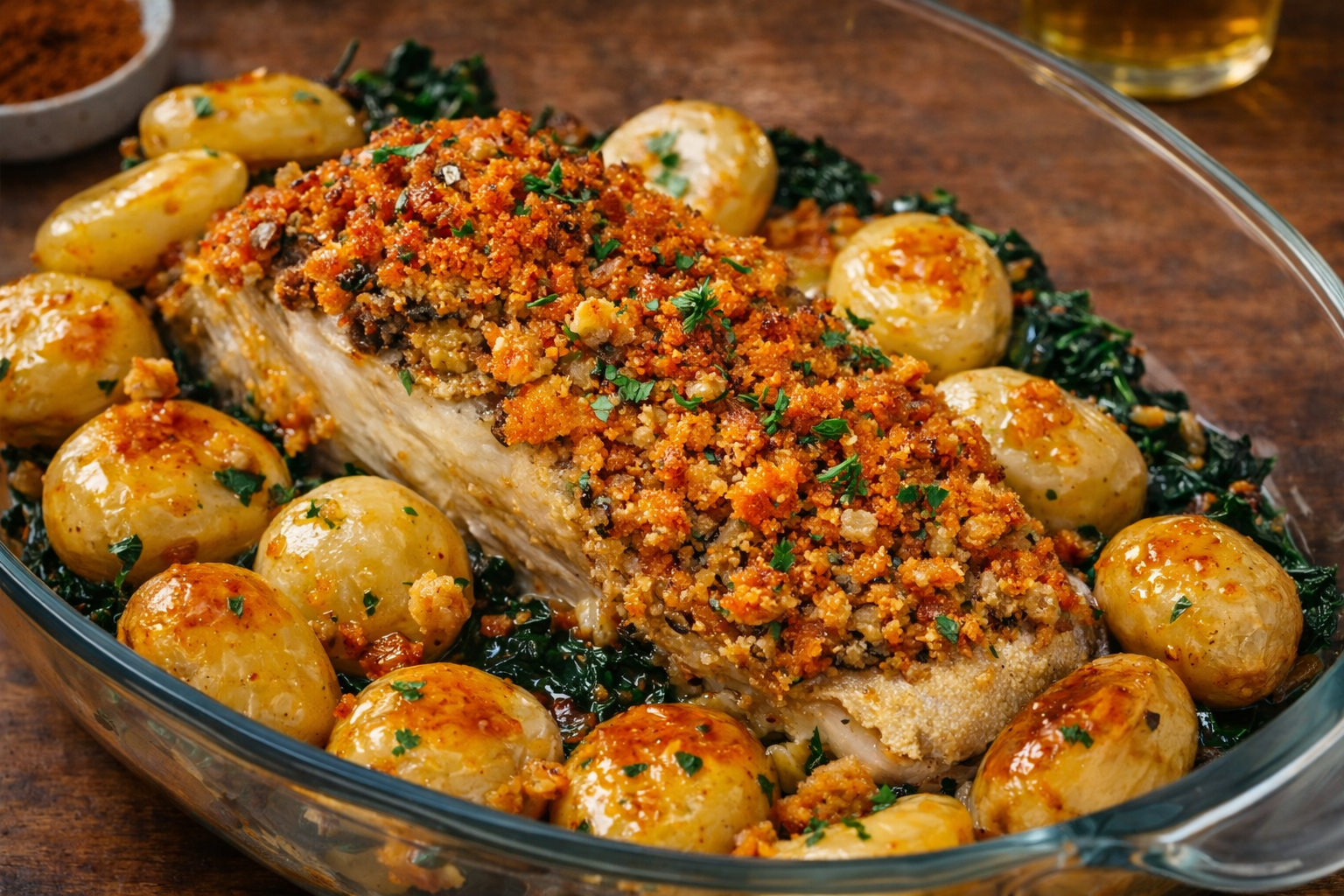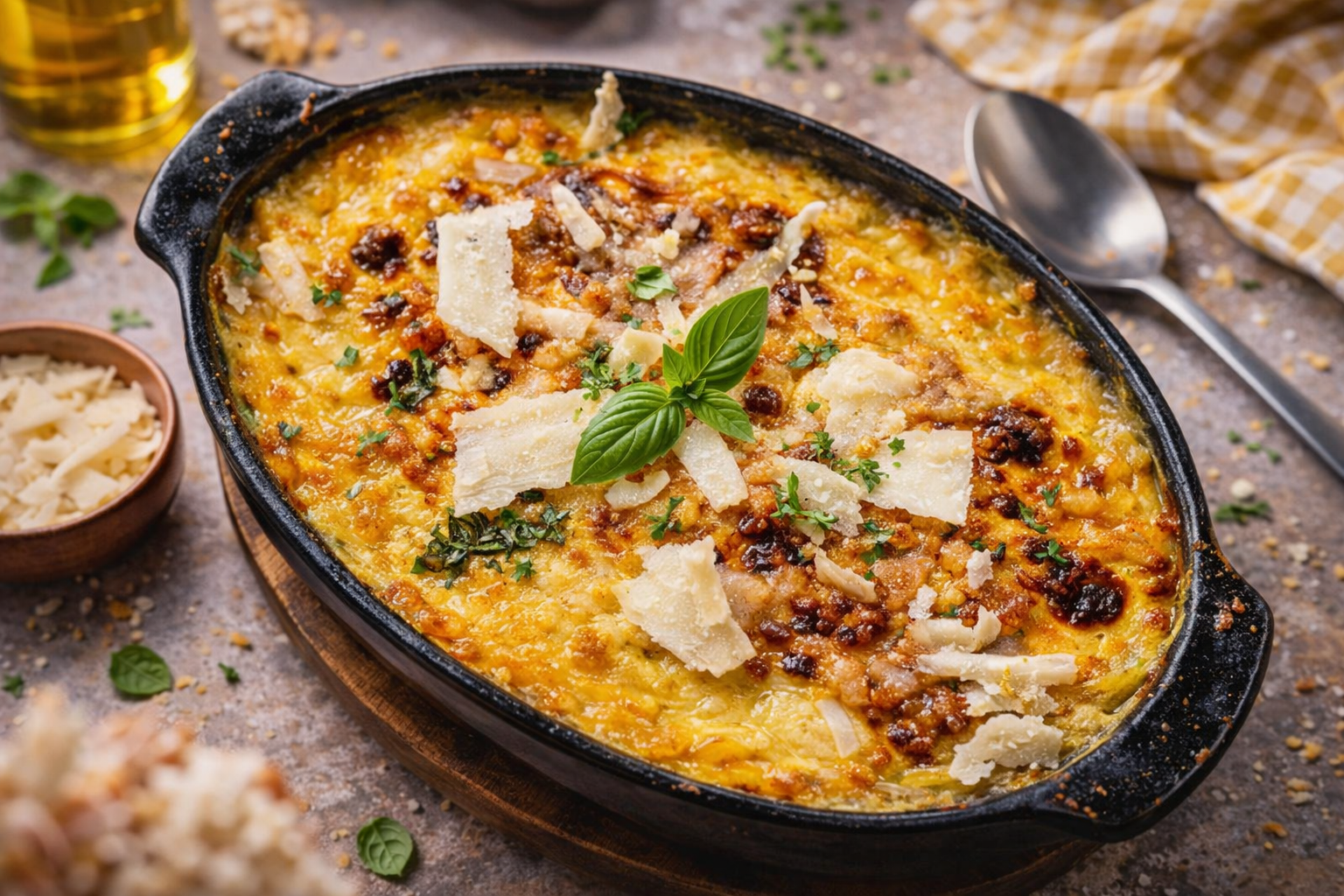 Transfira o preparado para uma travessa untada com manteiga, polvilhe o queijo ralado por cima do bacalhau espiritual e leve ao forno preaquecido a 180°C por 20 a 25 minutos, ou até dourar.