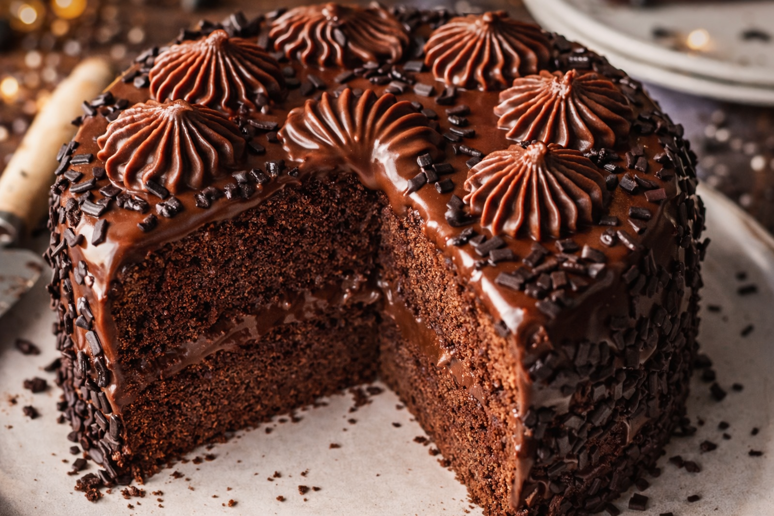Ao fim deste tempo, decore as laterais com pepitas de chocolate. Com o restante recheio de chocolate, encha um saco de pasteleiro e faça decorações no topo do bolo. O seu Bolo Brigadeiro está pronto a servir!