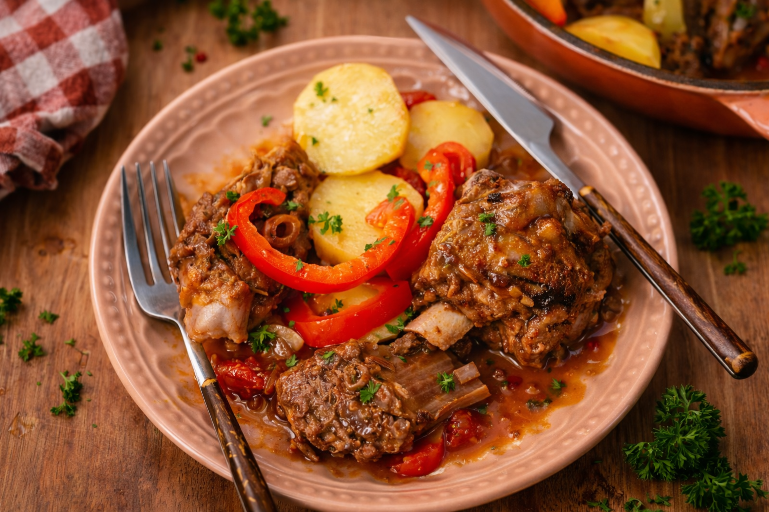Coloque o cabrito sobre as batatas e regue com a marinada.