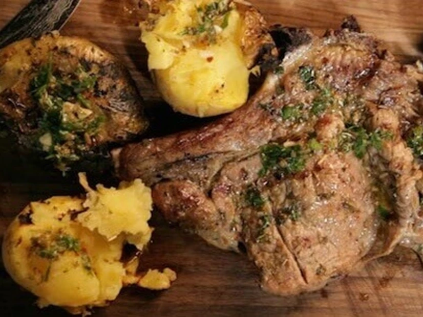 2.Temperar as costeletas de vitela com sal grosso dos dois lados, mariná-las no chimichurri e colocar a carne na grelha. Entretanto, esmagar as batatas (já cozidas) e colocá-las na grelha, quando estiverem douradas pincelar com um pouco da marinada de chimichurri.