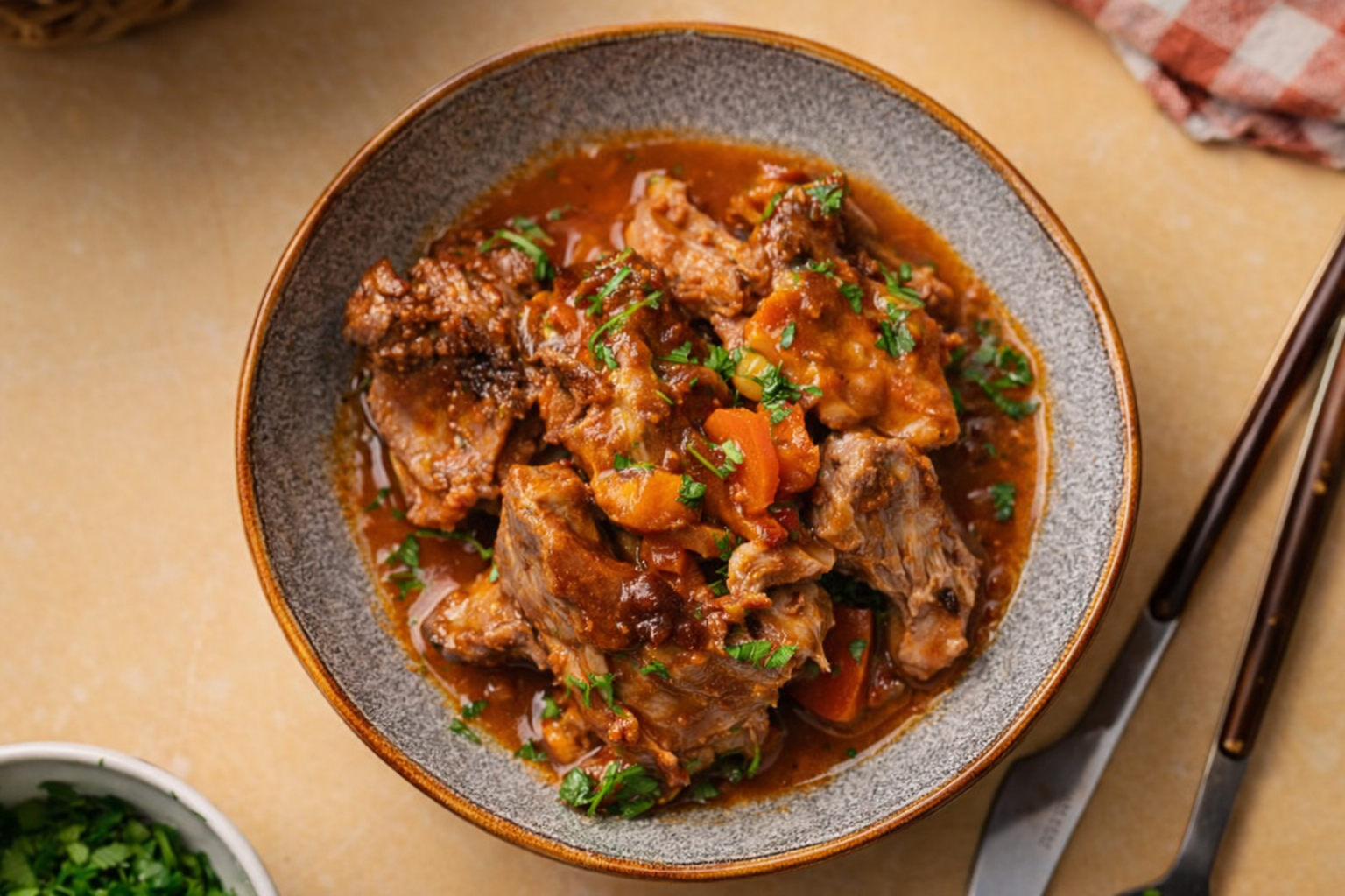 Coloque o ensopado numa taça, acompanhe com fatias de pão torrado e decore com hortelã.