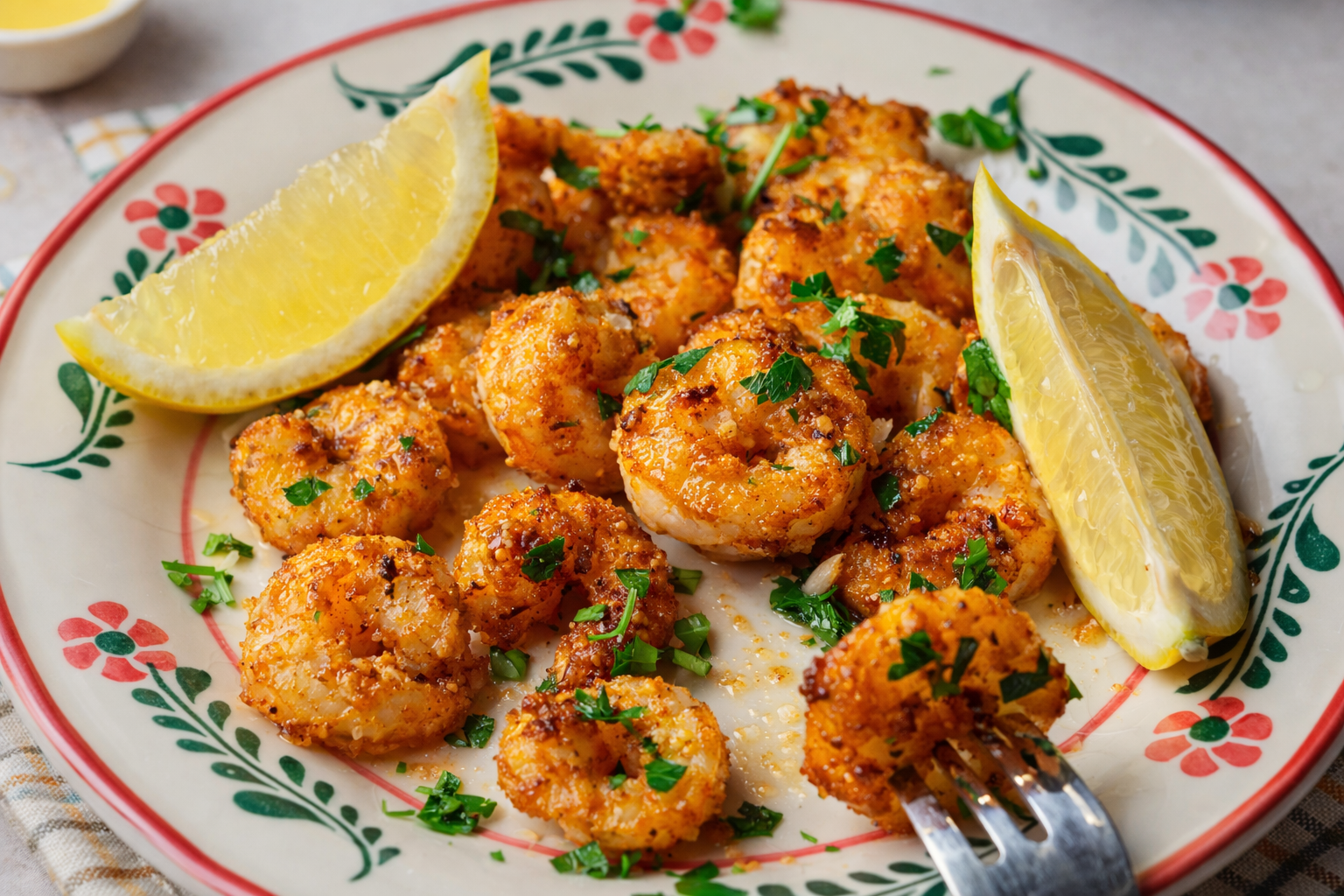 Comece por temperar o camarão com um pouco de sal e pimenta e o sumo de meio limão. Deixe marinar durante cerca de 10 minutos.