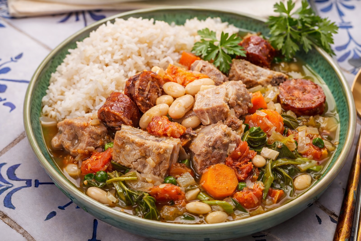 Junte o feijão escorrido e envolva. Junte o caldo de cozer as carnes, e se necessário, junte um pouco mais de caldo de cozer o feijão. Sirva a feijoada com arroz branco.