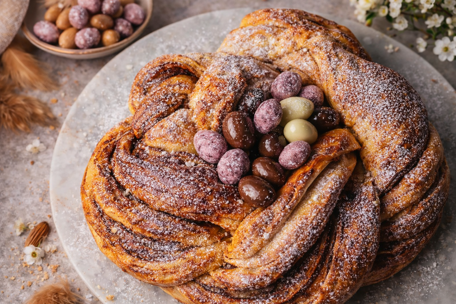 Decore o folar de páscoa com açúcar em pó e amêndoa de chocolate.