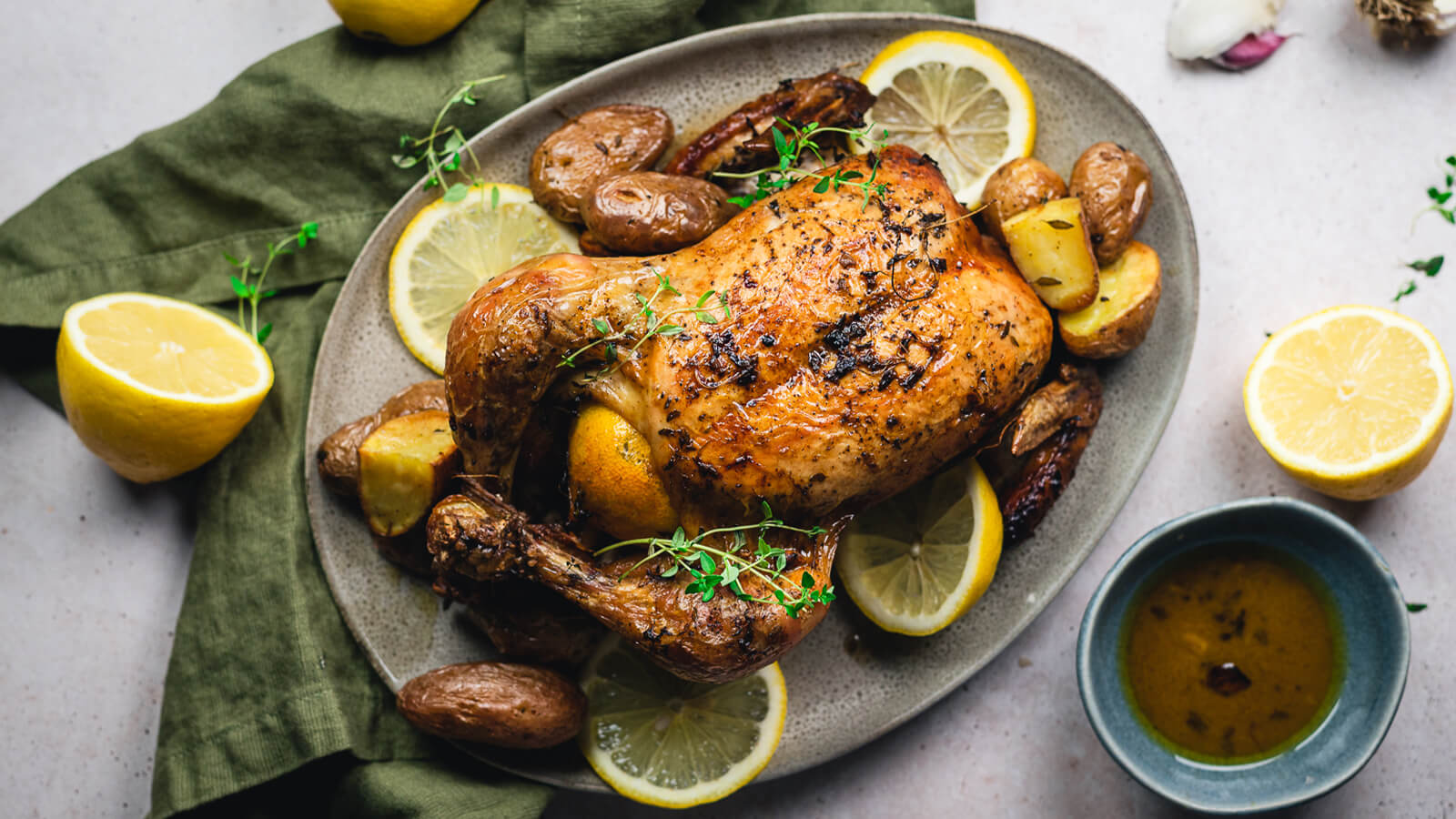 Sirva o frango assado com limão juntamente com as batatas assadas no forno. Decore com rodelas de limão e mais alecrim.
