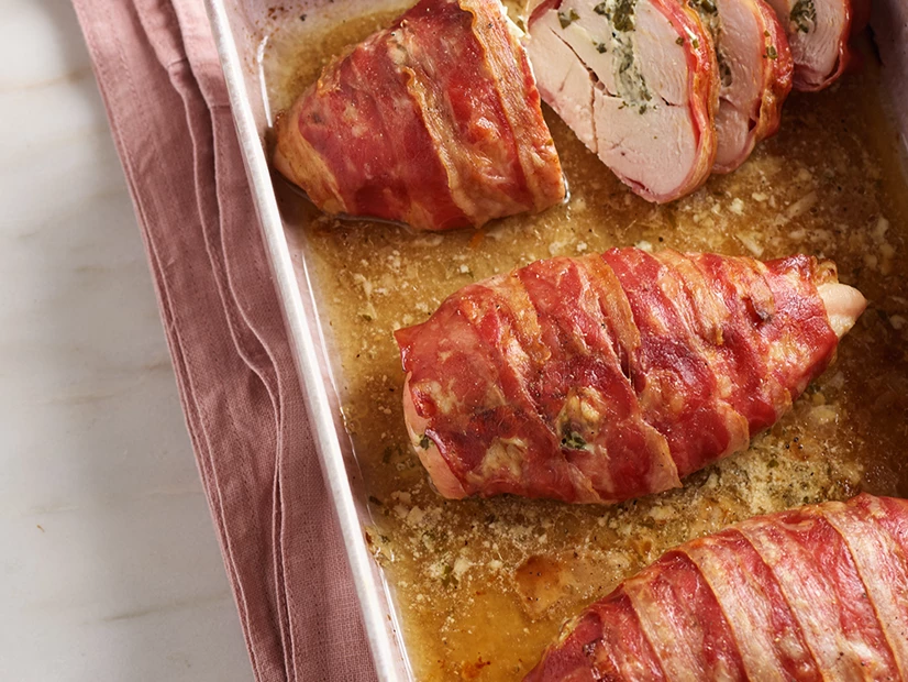 Feche-os e envolva 3 fatias de bacon à volta de cada um.