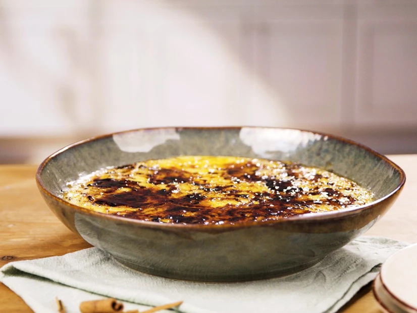 Colocar numa travessa ou num prato fundo, polvilhar com açúcar e queimar com um ferro ou um maçarico.