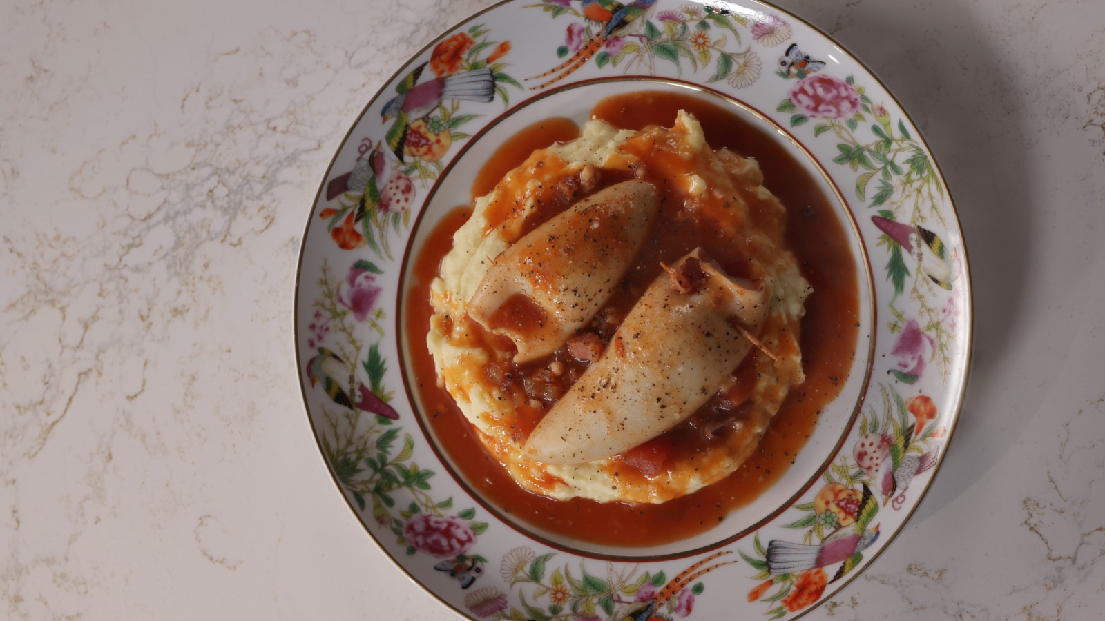 Sirva o puré de batata e por cima disponha as lulas estufadas regando com molho e decore com salsa picada a gosto.