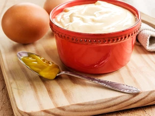 Comece por colocar 100 g de iogurte natural numa taça juntamente com 50 g de maionese.