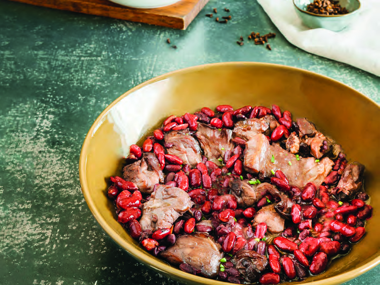 Leve ao lume o azeite com o alho e a cebola em meias luas e deixe alourar. Junte a carne de novilho cortada em cubos, deixe alourar e polvilhe com a farinha. Tempere de sal e pimenta, envolva bem e regue com o vinho tinto. Deixe cozinhar em lume muito brando durante três quartos de hora.