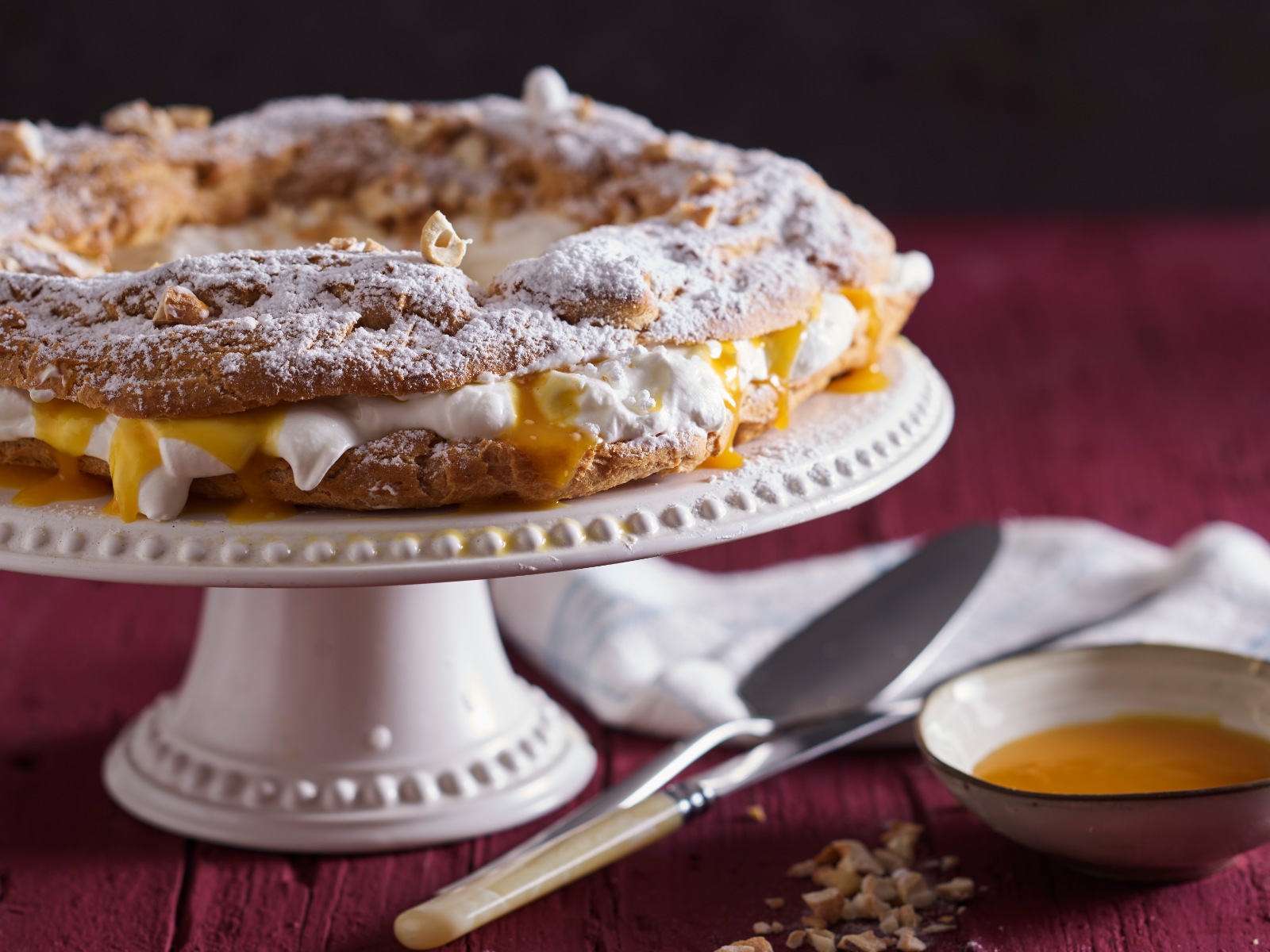 O Paris Brest com puré de dióspiro e amêndoa é uma sobremesa elegante e cheia de sabor, que dá um toque moderno ao clássico francês. A combinação do dióspiro com a amêndoa realça a textura leve da massa choux e transforma este doce num final perfeito para qualquer refeição.