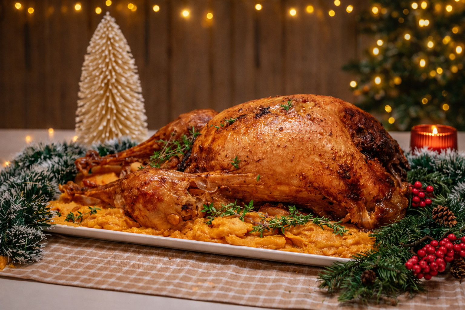 Servir, fatiando o peru e servir com puré de batata-doce ou legumes assados. Regar cada fatia com o molho do assado.