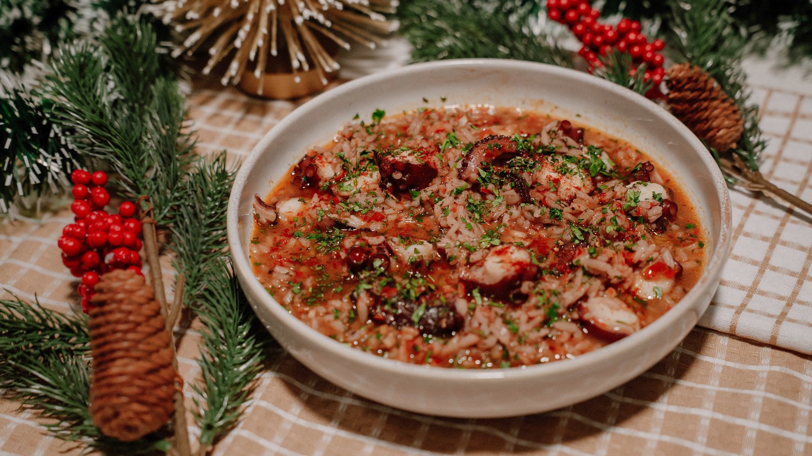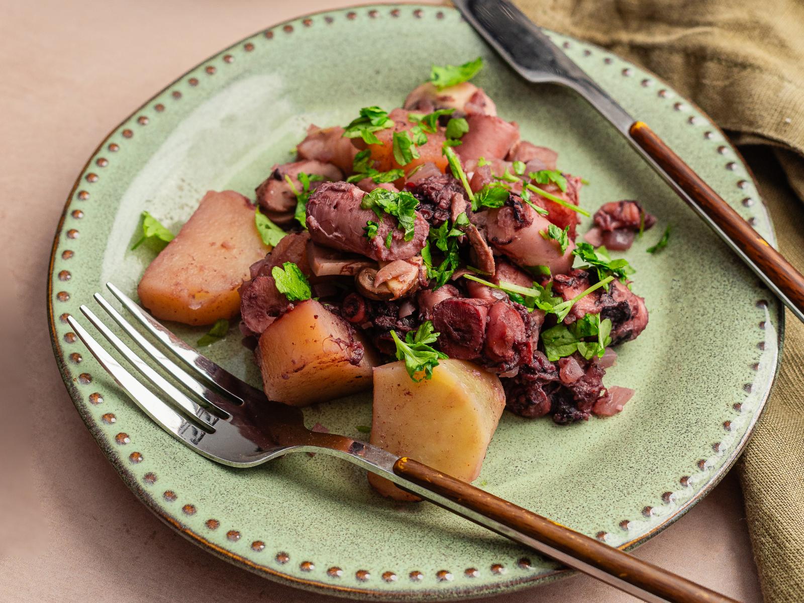 Sirva as batatas e por cima disponha os pedaços de polvo. Regue com 1 fio de azeite e decorre com paprika em pó.