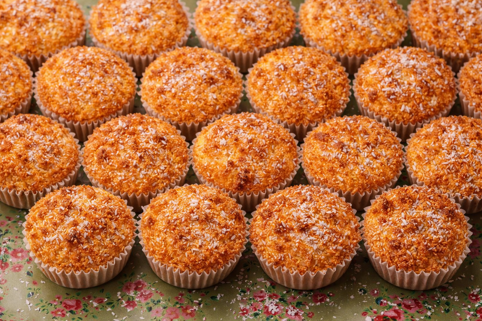 Desenforme os quindins ainda quentes com cuidado. Decore com coco ralado e raspa de lima.