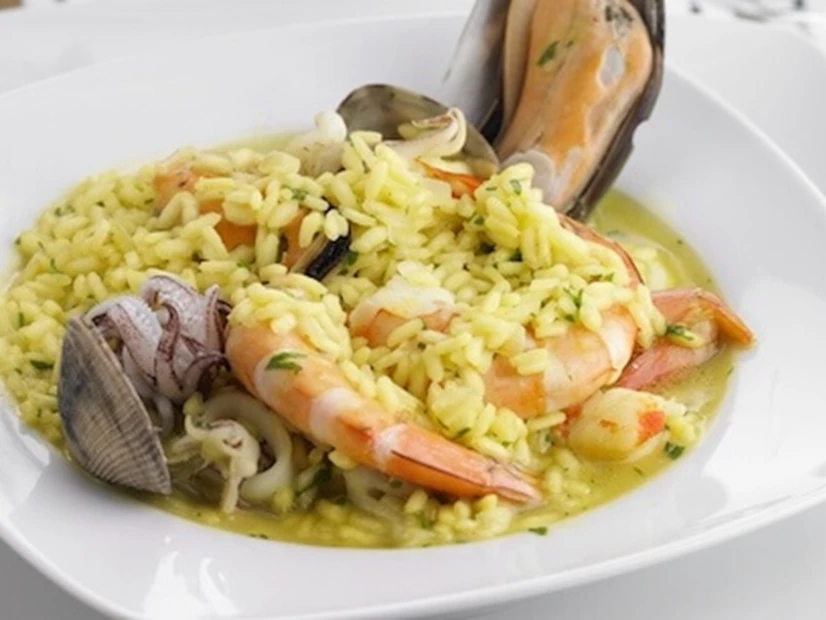 Coloque o açafrão num copo com água quente, reserve em infusão enquanto cozinha o marisco. Junte o caldo de peixe e o vinho num tacho até levantar fervura, baixe o lume e adicione as gambas durante 2 minutos. Adicione as lulas e cozinhe durante 1 minuto. Retire o marisco e reserve.