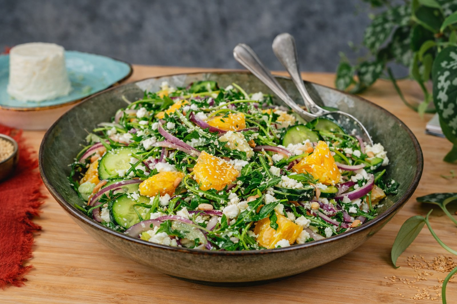 Coloque numa saladeira a rúcula, o pepino às rodelas, a cebola roxa laminada, a laranja em gomos, o queijo fresco esfarelado, os pinhões e a salsa picada.