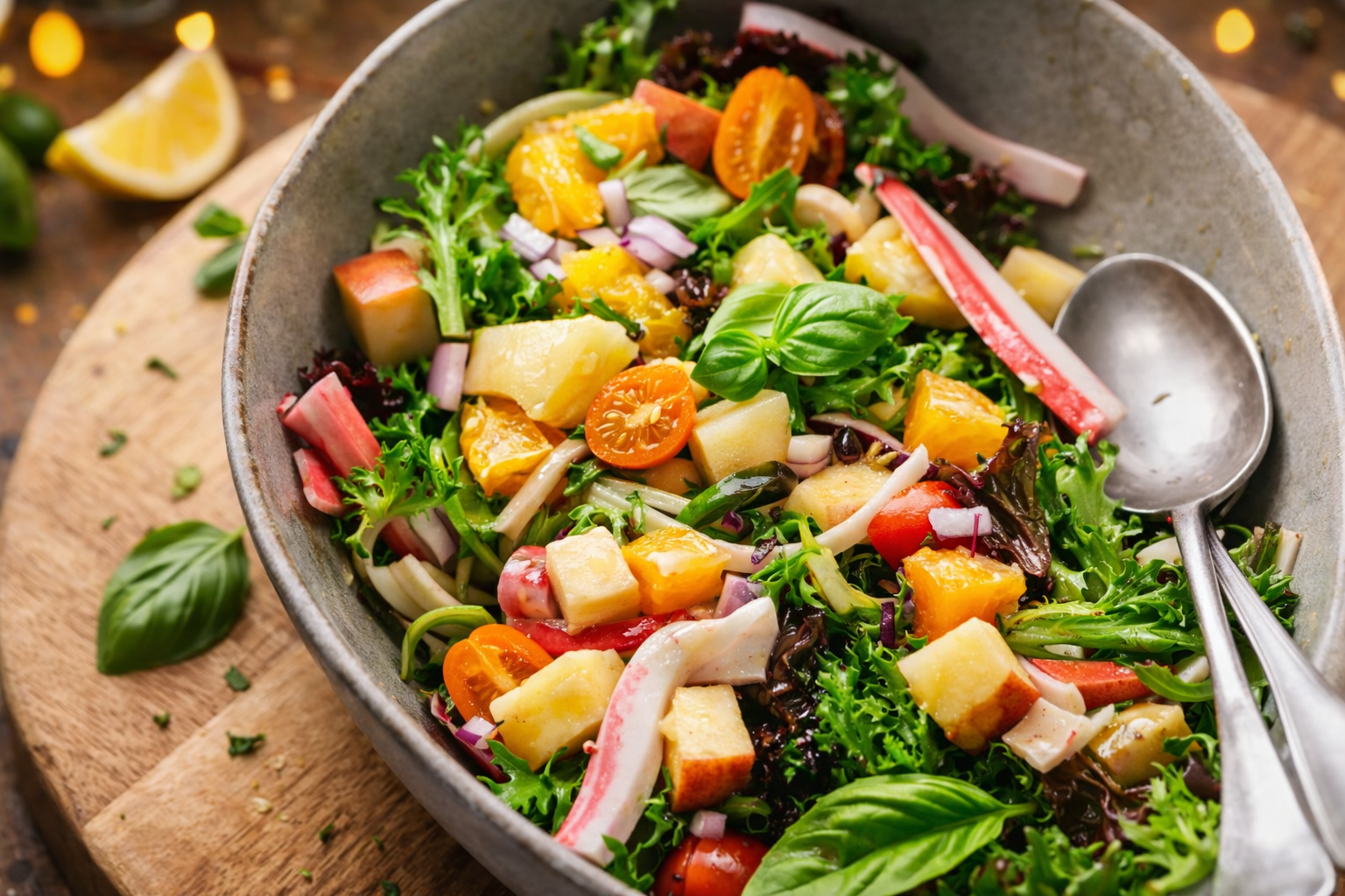 Finalize com manjericão e tempere com sal, vinagre e azeite. Envolva tudo e sirva.