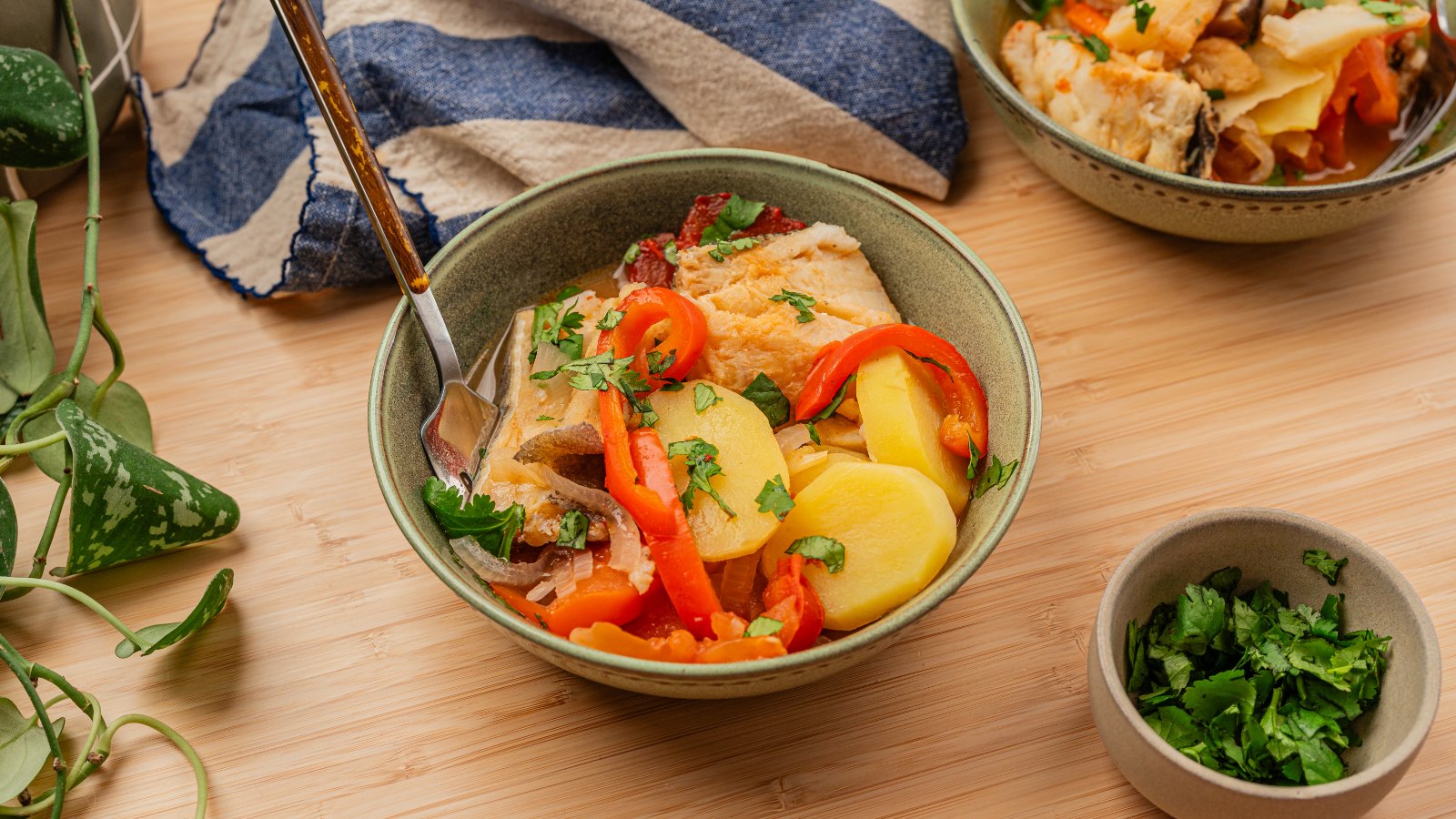 Retire do calor e junte às lascas de bacalhau, parte do queijo e as gemas. Tempere com sal, pimenta e noz-moscada.