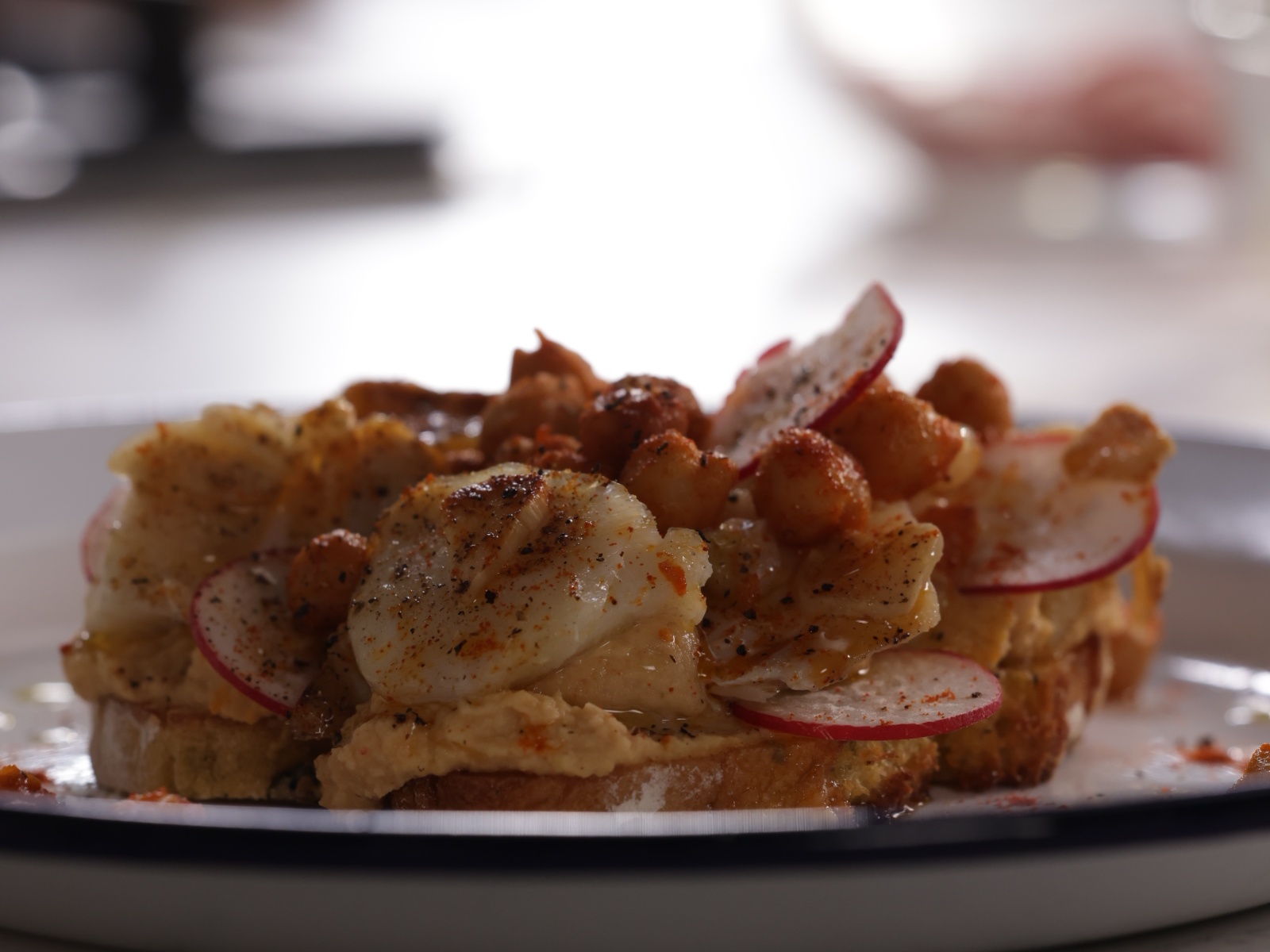 Sirva o puré de grão por cima da broa tostada; guarneça com o bacalhau, o grão tostado e o rabanete. Tempere com vinagre, sal e pimenta preta.