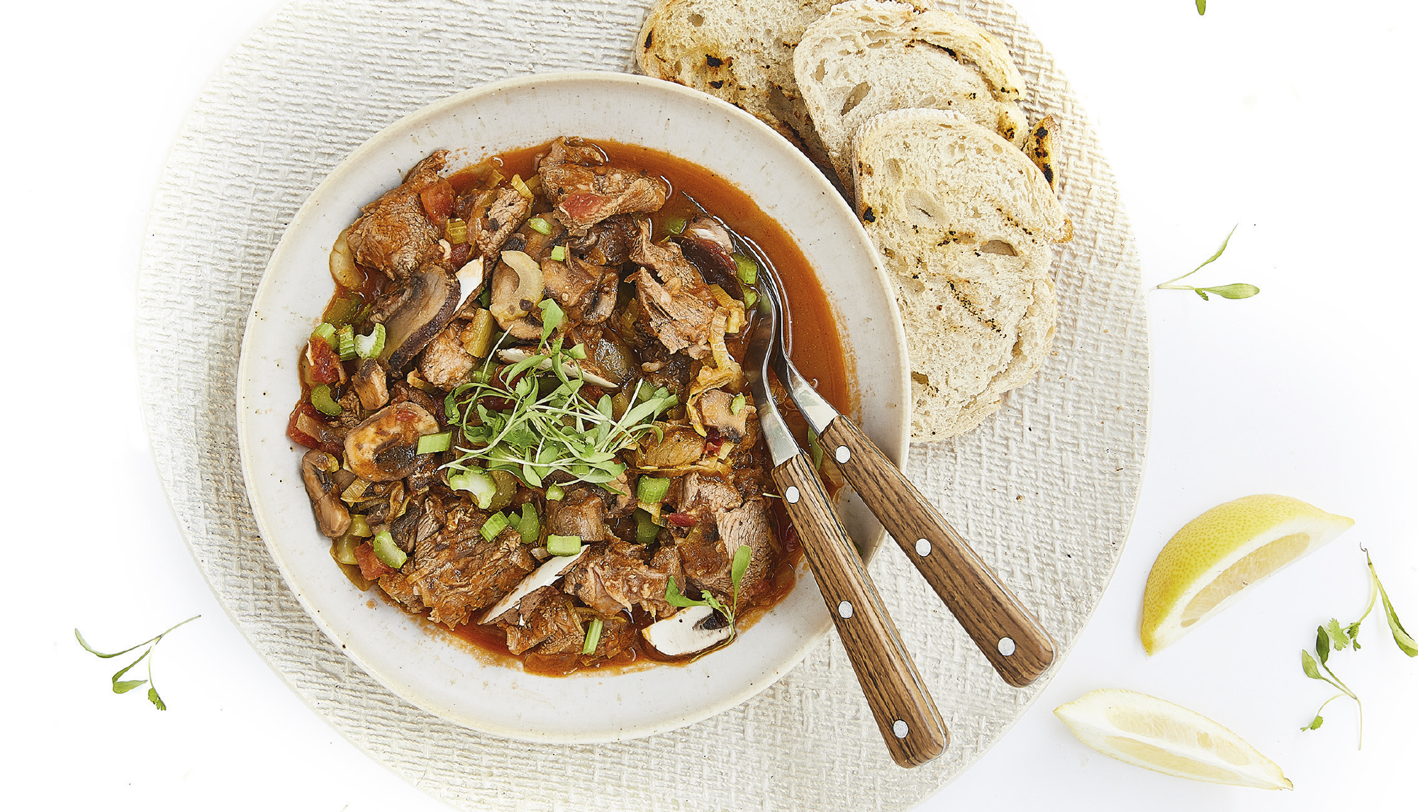 Junte a carne de vaca e o vinho branco e deixe estufar tapado por alguns minutos.