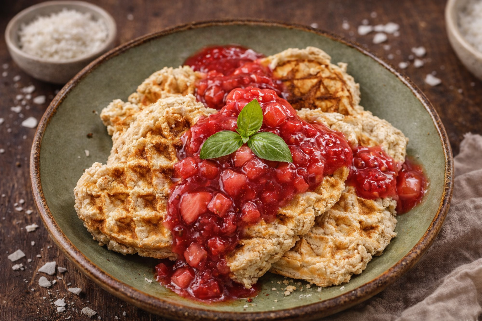 Unte a máquina de fazer waffles com um pouco de óleo de coco e cozinhe colheradas de massa, de modo a fazer 4 waffles bem dourados.