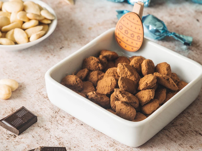 5.Transfira as amêndoas para este recipiente, tape-o e abane vigorosamente para que fiquem todas bem misturadas com o cacau e o chocolate em pó. Separe algumas que possam ficar coladas e volte a abanar.