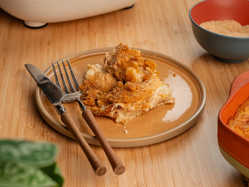 Ainda com o misturador sobre a lâmina, junte o molho bechamel reservado, as natas, sal e pimenta a gosto e programe 2 minutos, a 95°C, velocidade 2 na Rotação Inversa.