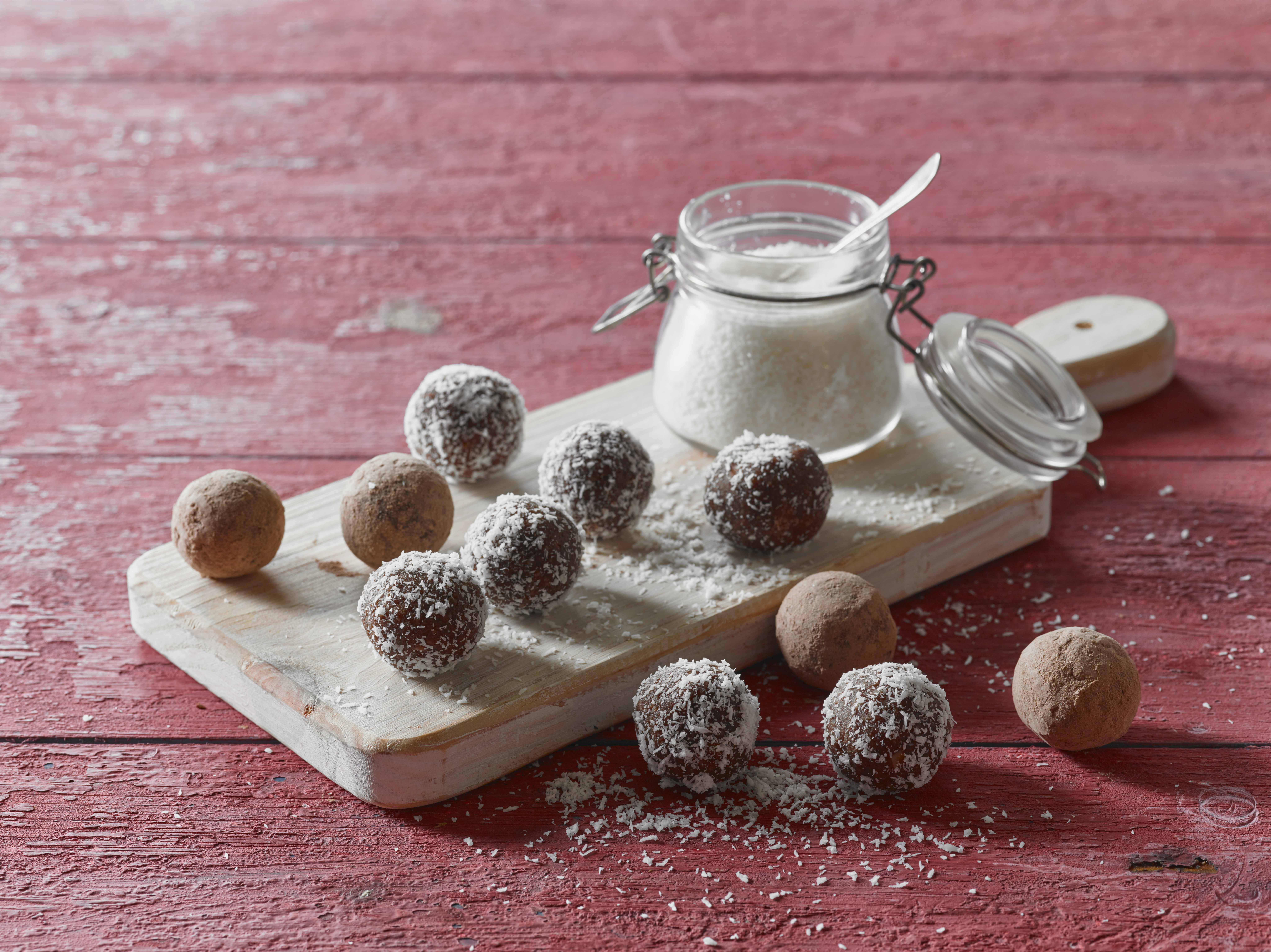 Molde bolinhas e passe-as por cacau em pó ou coco ralado. Leve novamente ao frigorífico, onde deverão ser mantidas até à hora de servir.