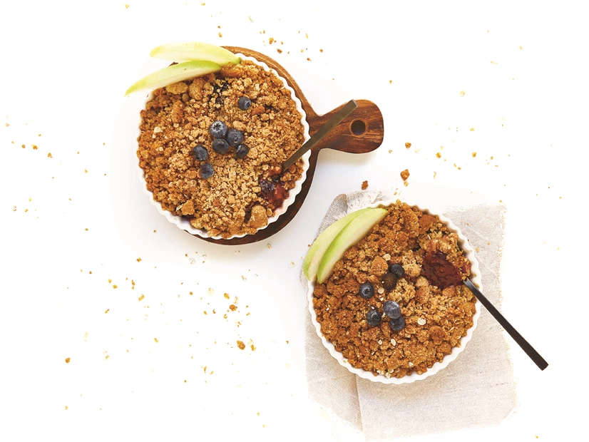 Lave bem a maçã e corte em pequenos cubos. Coloque em duas tacinhas, cubra com os mirtilos e termine com o crumble.