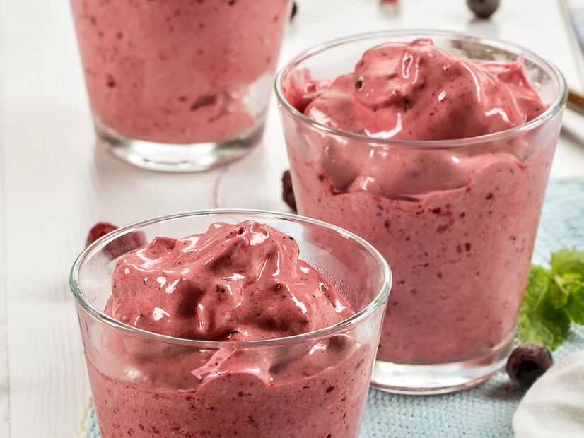 Acrescente os frutos vermelhos congelados e o sumo de limão e regule 30 segundos na velocidade 11. Com a espátula, faça descer o que ficou acumulado nas paredes do copo e programe mais 30 segundos na velocidade 11. Verifique se o preparado ficou homogéneo e, se necessário, triture mais uns segundos na mesma velocidade.
