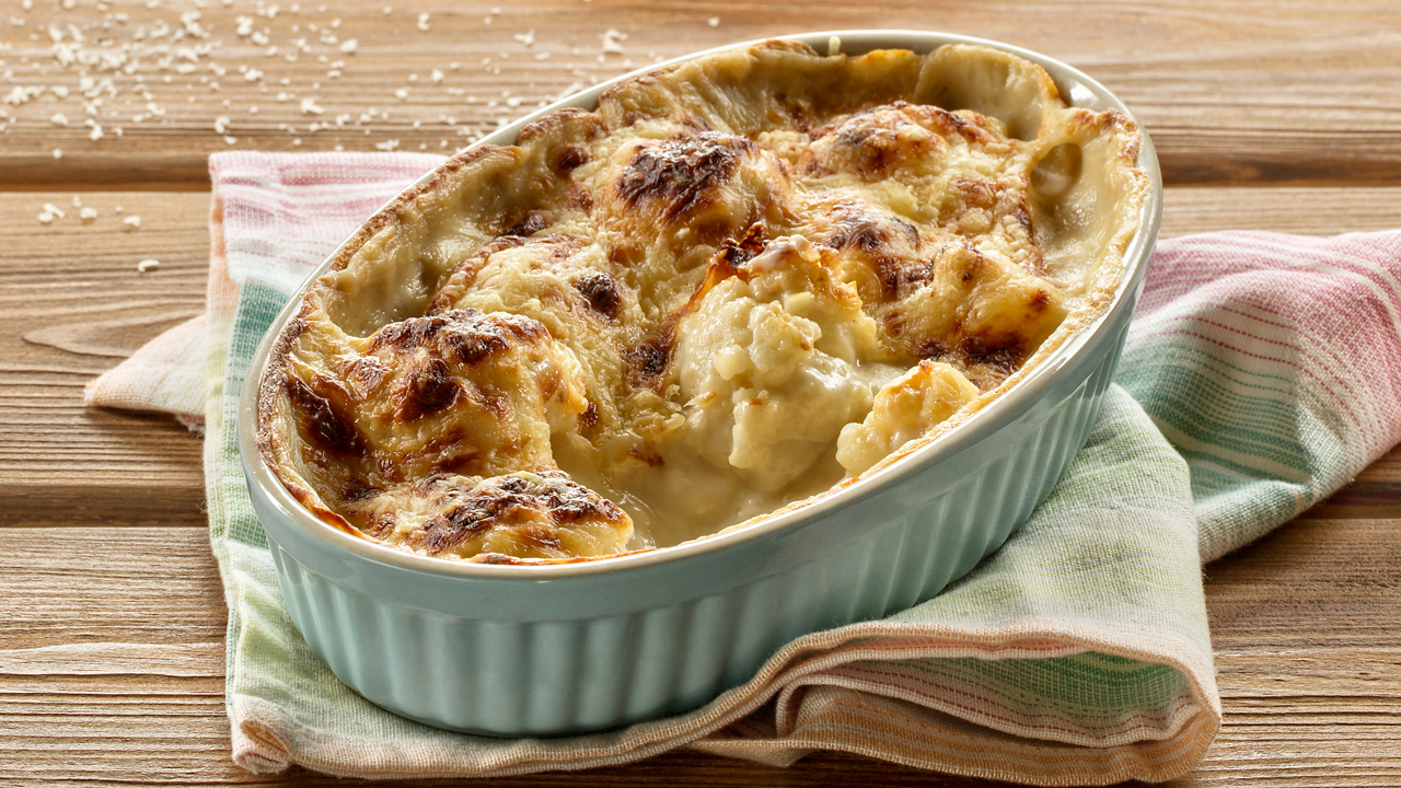 Disponha a couve-flor (bem escorrida) num pirex de ir ao forno e regue-a com o molho bechamel.