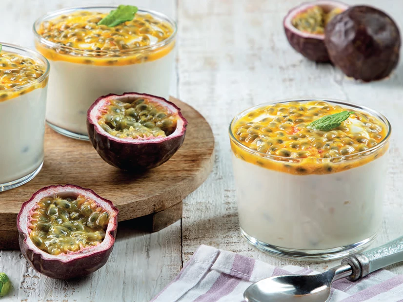 Decore com maracujá fresco ou polpa de maracujá em lata.