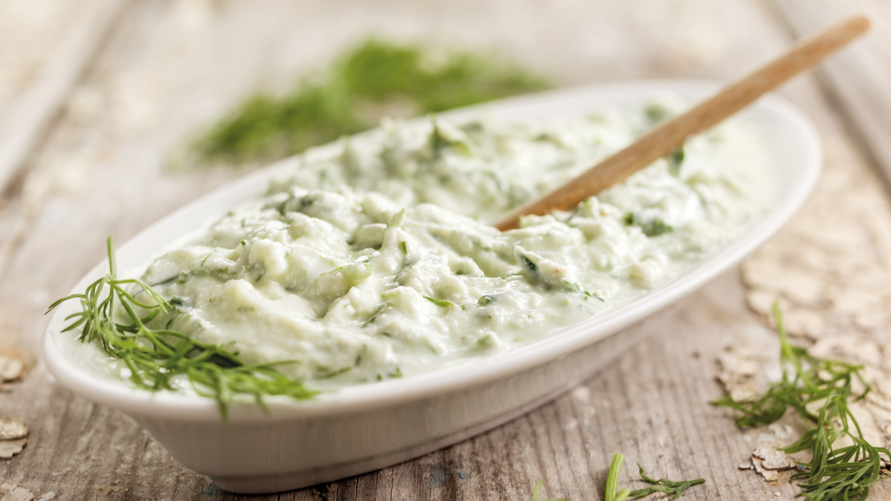 Com uma faca, corte grosseiramente o cebolinho e o aneto. Coloque‑os no copo, juntamente com o alho, e pique 10 segundos na velocidade 8. Com a ajuda da espátula, faça descer o que ficou acumulado nas paredes do copo e regule mais 10 segundos na velocidade 8. Repita o processo mais uma vez, se necessário.