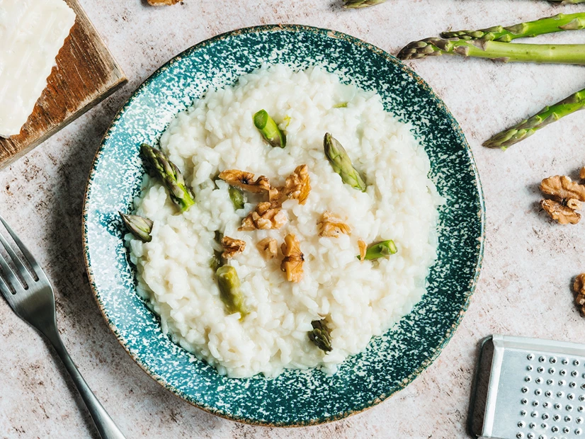 Coloque o misturador sobre a lâmina. Adicione o vinho, a água, o arroz, o caldo de legumes, sal a gosto e os espargos reservados, e programe 15 minutos a 100°C na velocidade 1 com a Rotação inversa.
