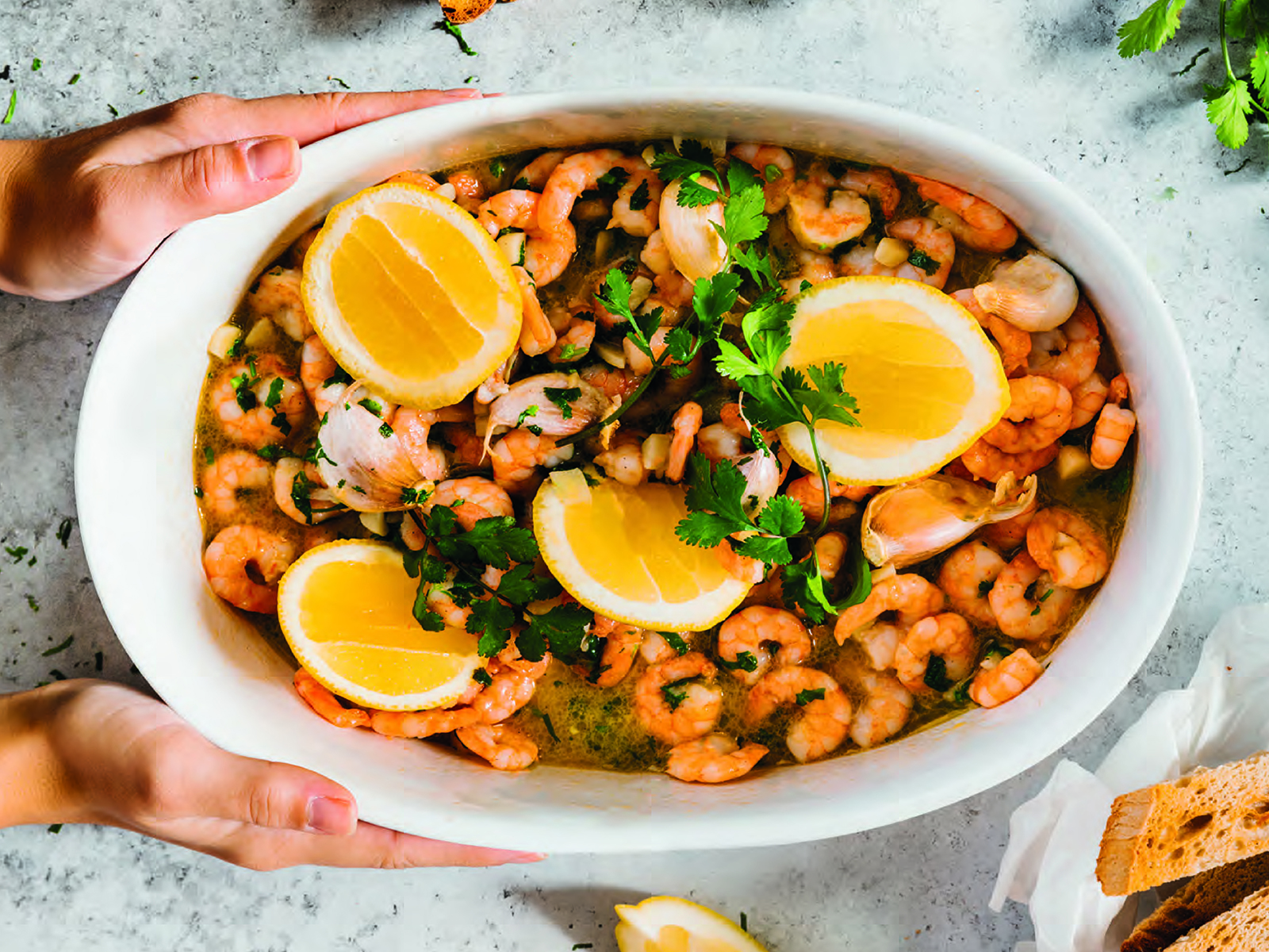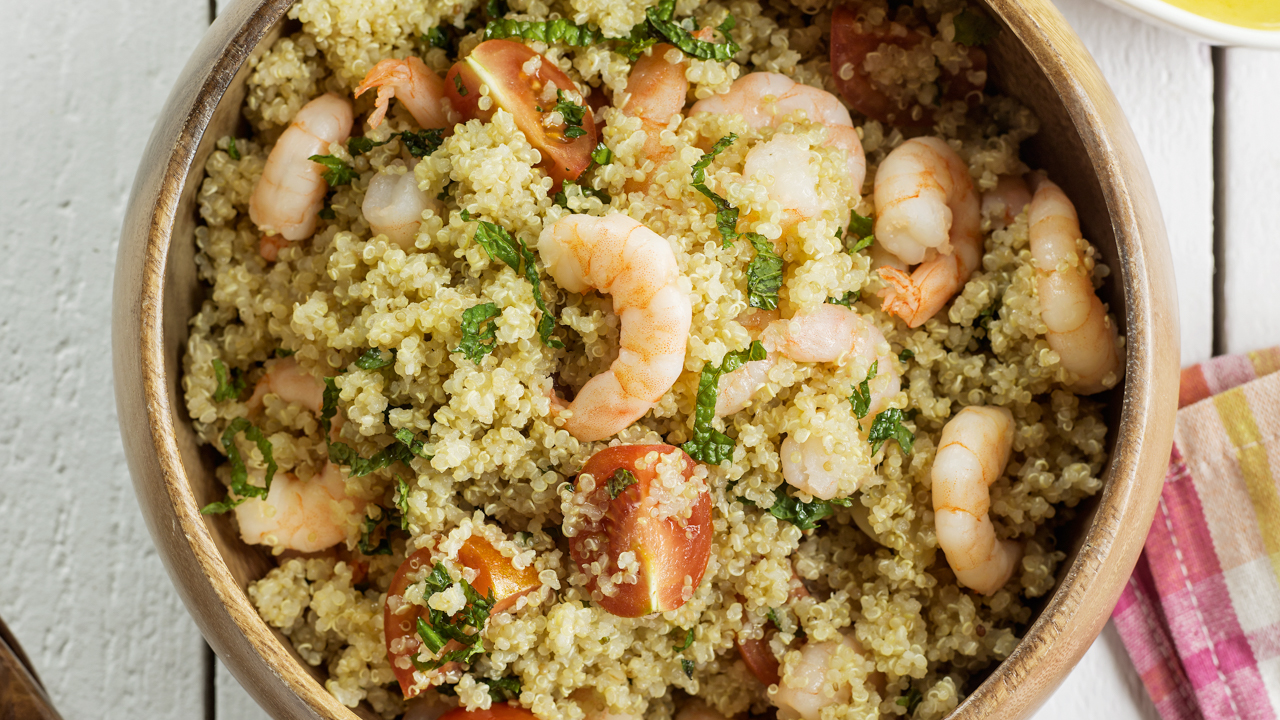 Depois de terem arrefecido, regue a quinoa com um fio de azeite e com o sumo de limão, tempere com um pouco de sal e pimenta e adicione os camarões, o tomate‑cereja cortado ao meio e a hortelã picada, envolvendo bem todos os ingredientes.