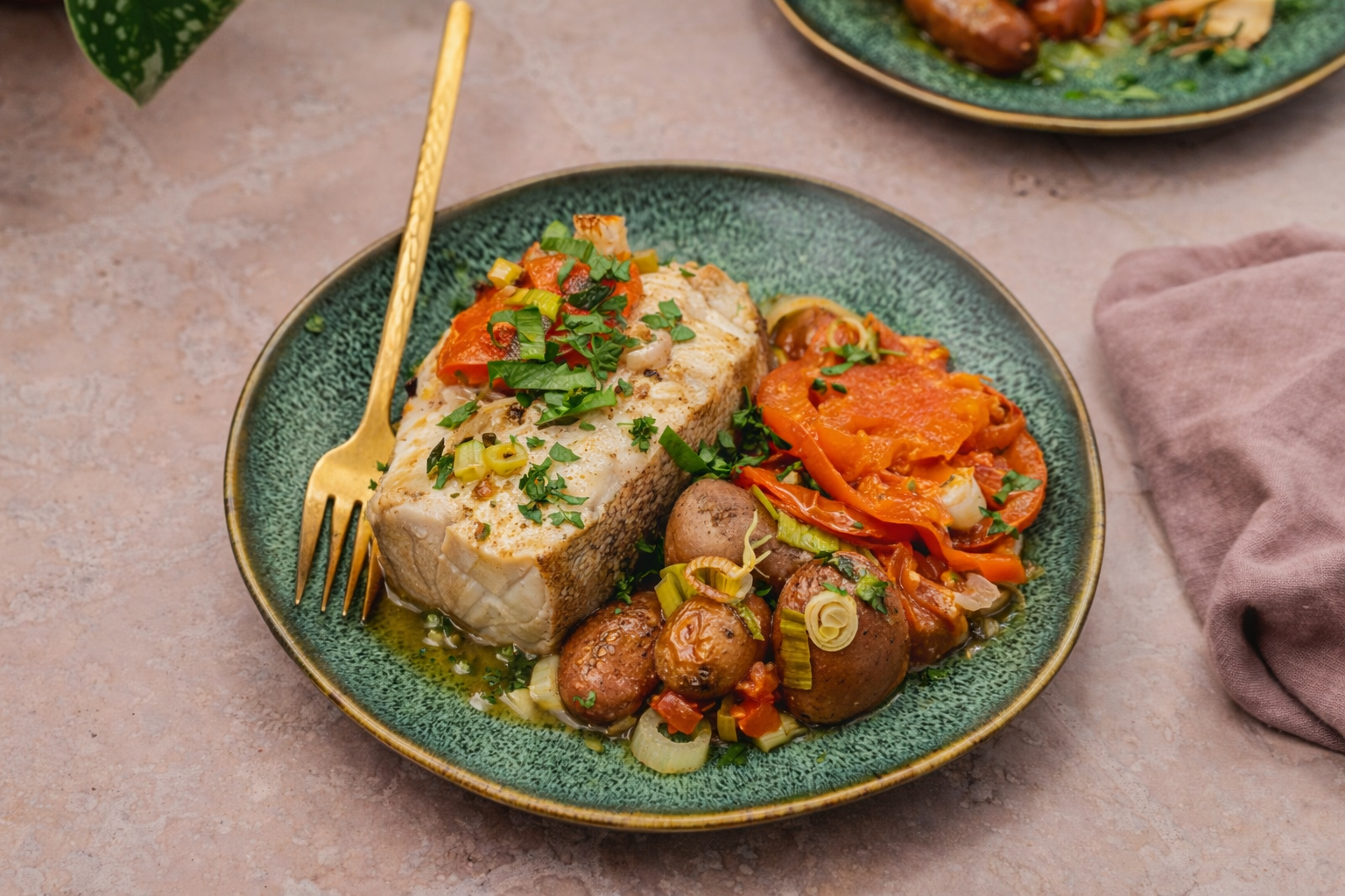 Para o salmão, coloque na bandeja uma folha de papel vegetal e por cima as duas postas de salmão. Tempere com o sal, o alho em pó, o gengibre, o cerefólio e a pimenta.