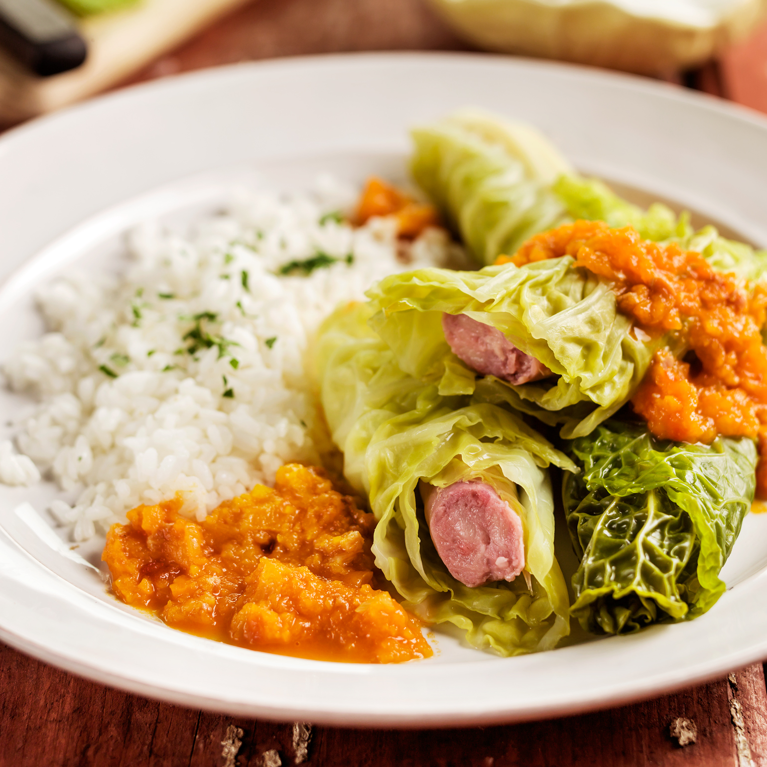 Escalde as folhas de couve-lombarda em água a ferver temperada com sal. Escorra-as bem e enrole as salsichas com as folhas. Disponha-as na bandeja de vapor e reserve.