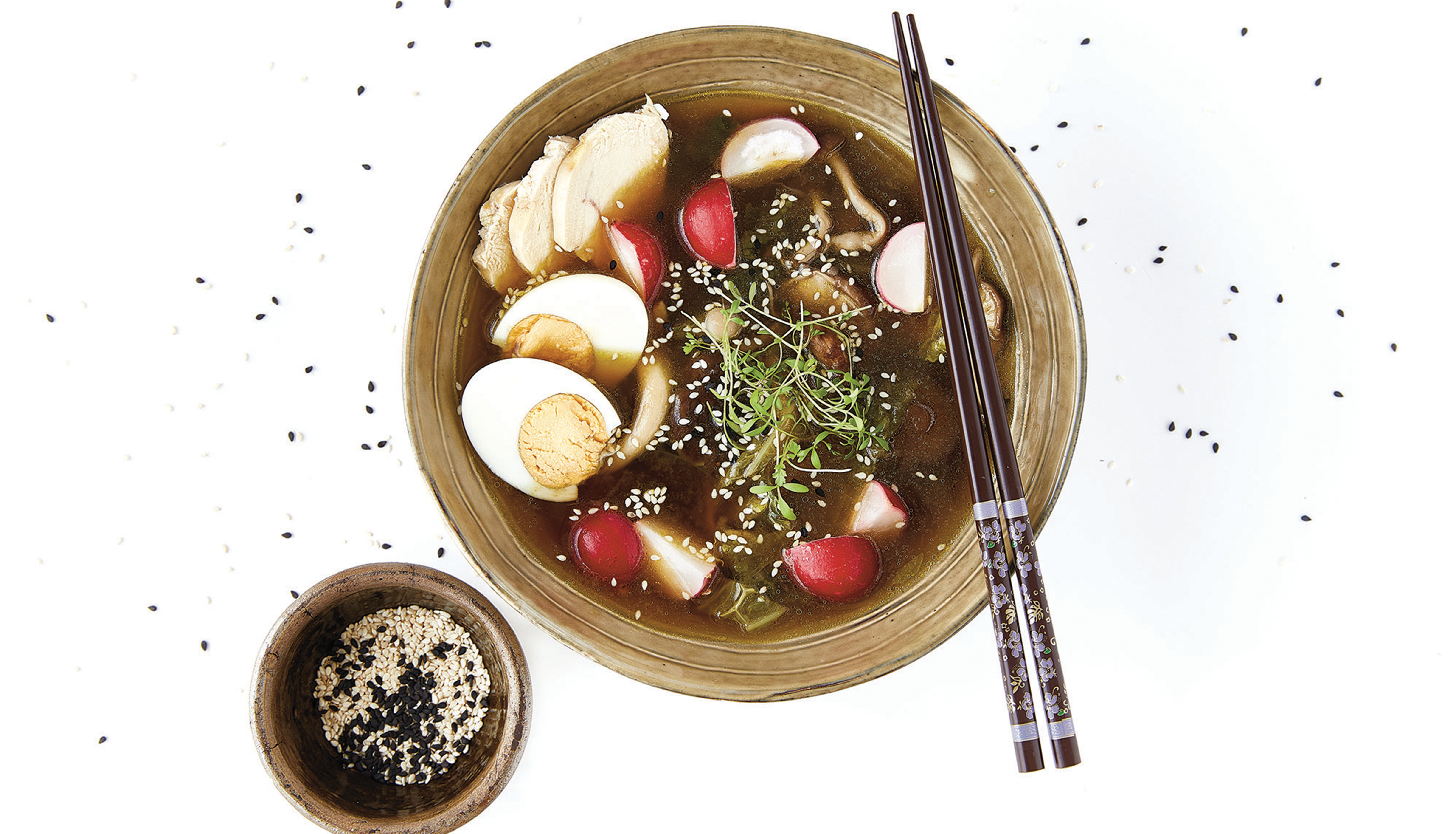Sirva a sopa miso em taças com o frango fatiado e o ovo e acompanhe com os rabanetes em gomos.